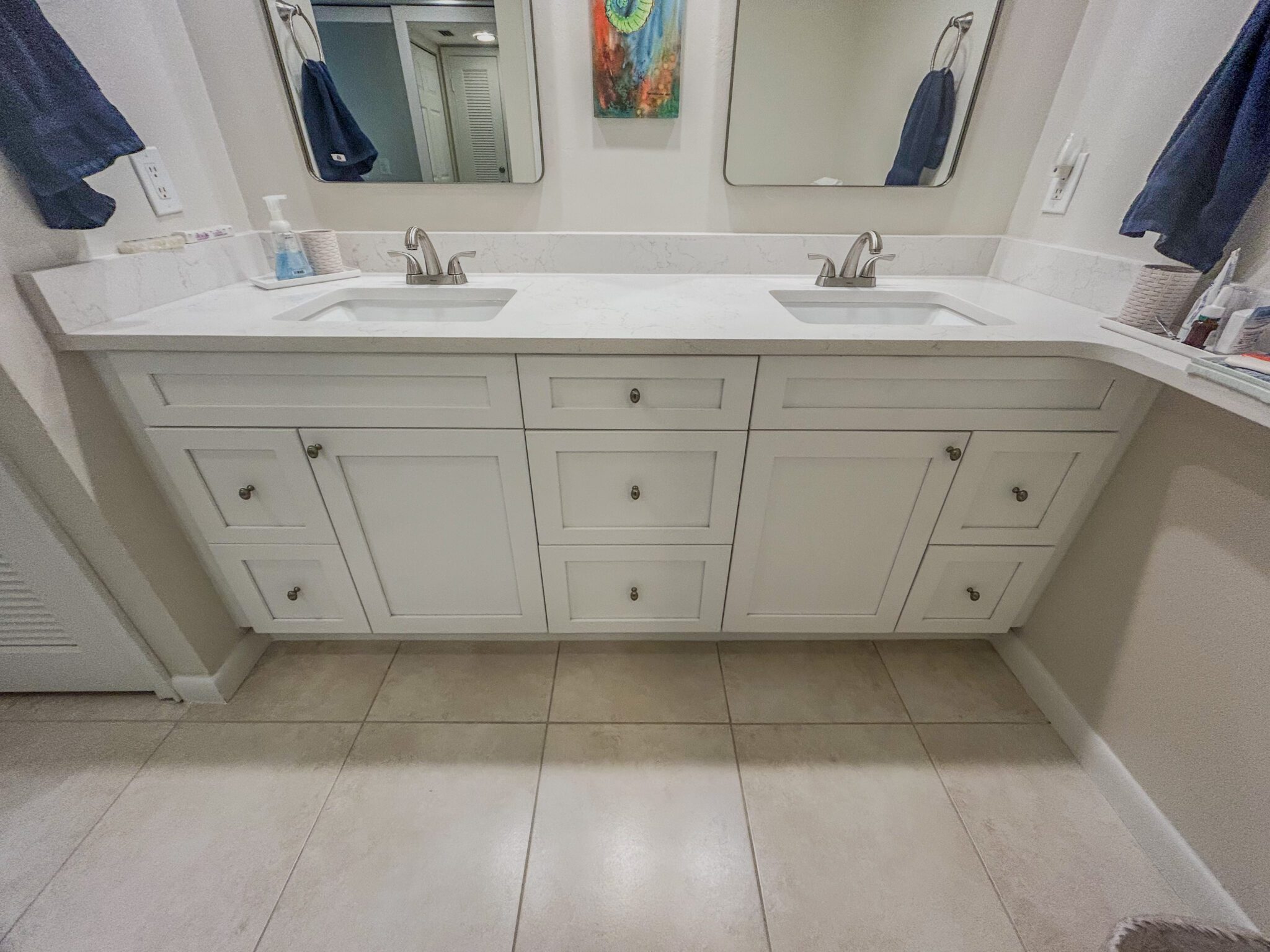 - Bathroom Remodeling: Our skilled bathroom renovation contractors revitalized a sophisticated new vanity, quartz countertops, backsplash, and carefully selected customer-supplied fixtures. The space now blends modern elegance with timeless functionality while the original appliances, shower, and tile remain untouched for contrast.